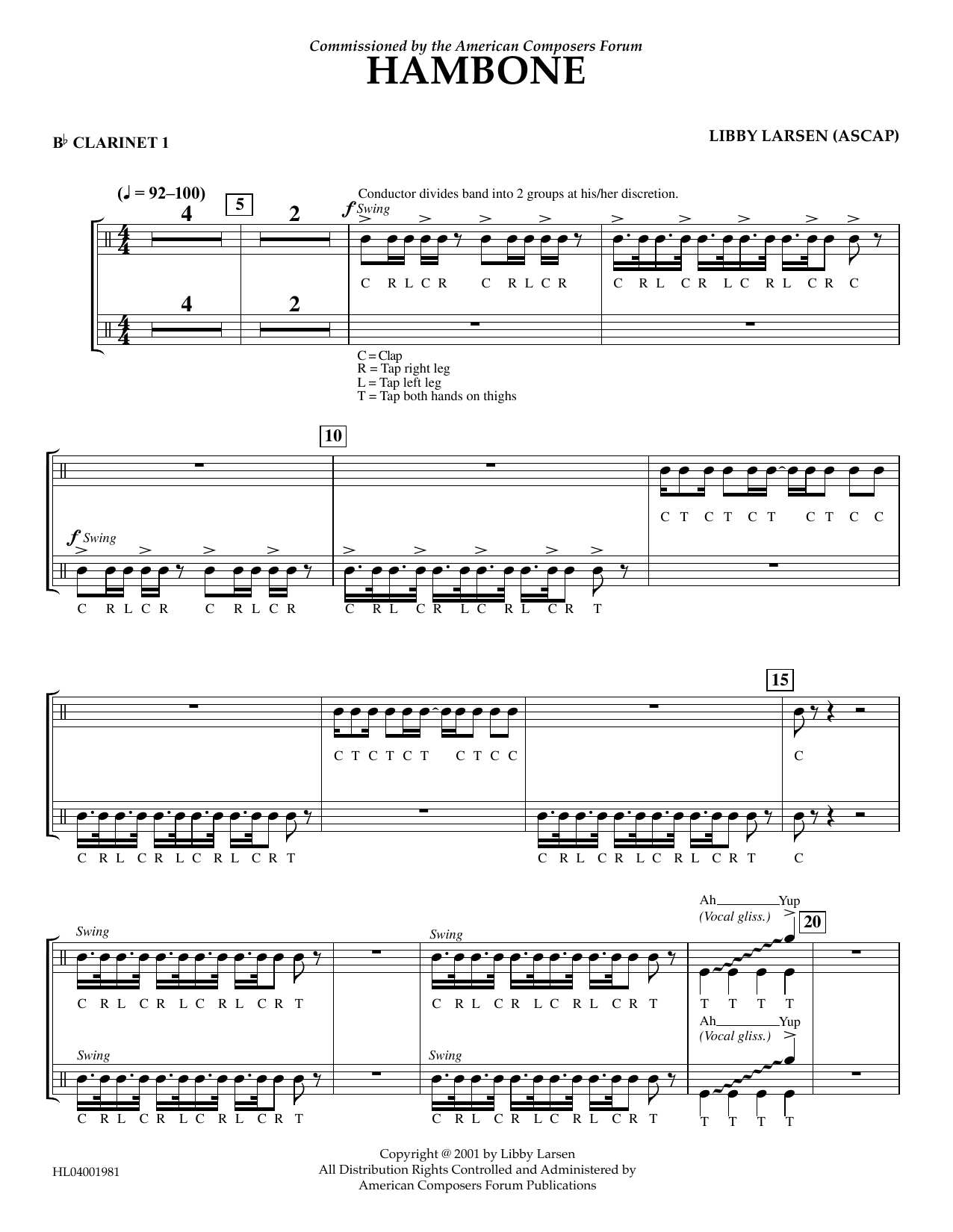 Download or print Libby Larsen Hambone - Bb Clarinet 1 sheet music, chords and digital score arranged for Concert Band. This Concert score includes 3 page(s).