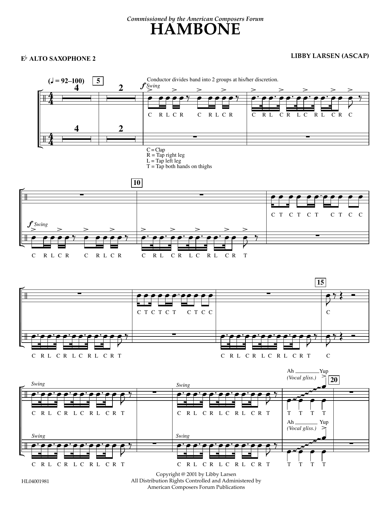 Download or print Libby Larsen Hambone - Eb Alto Sax 2 sheet music, chords and digital score arranged for Concert Band. This Concert score includes 3 page(s).
