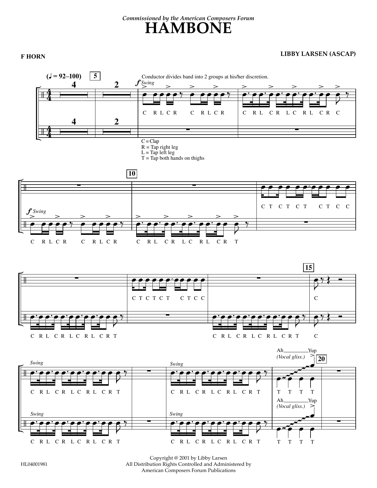 Download or print Libby Larsen Hambone - F Horn sheet music, chords and digital score arranged for Concert Band. This Concert score includes 3 page(s).