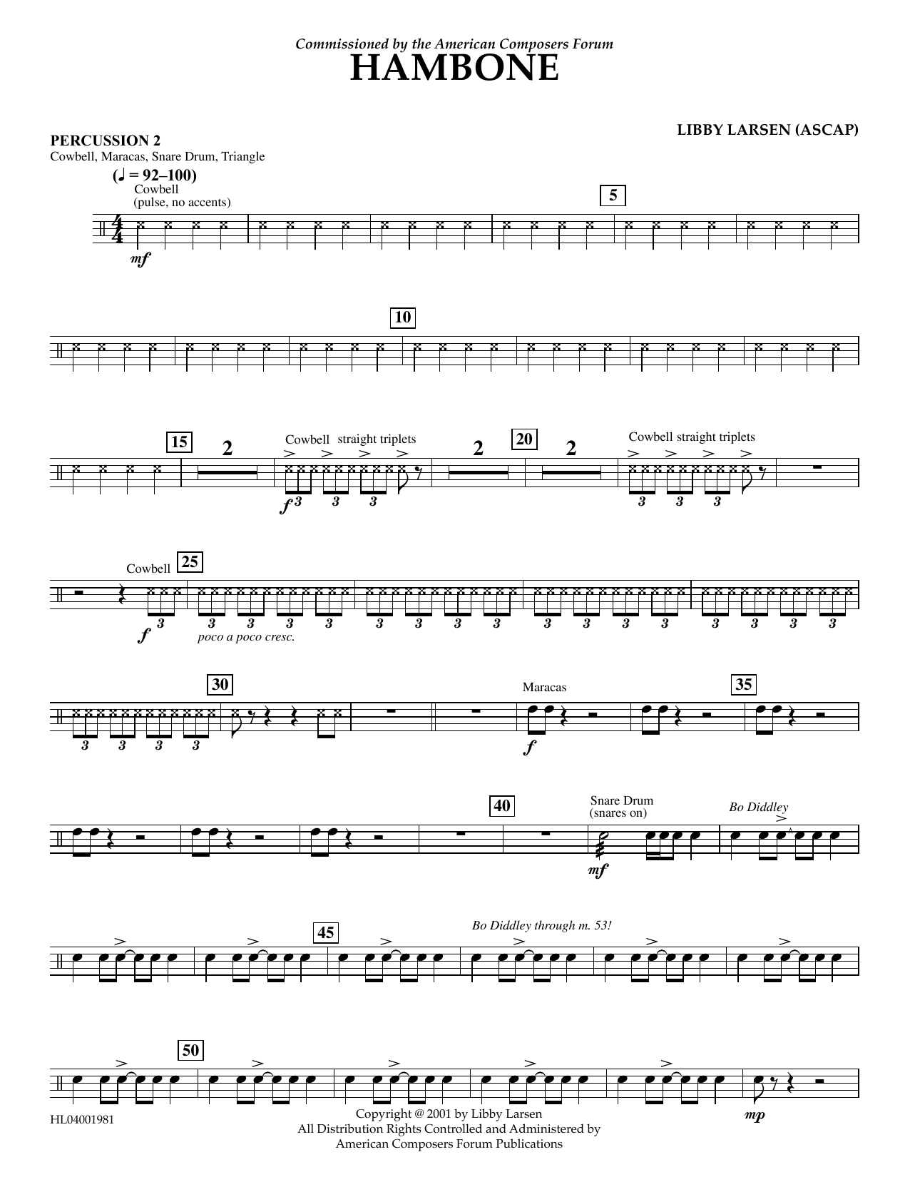 Download or print Libby Larsen Hambone - Percussion 2 sheet music, chords and digital score arranged for Concert Band. This Concert score includes 2 page(s).