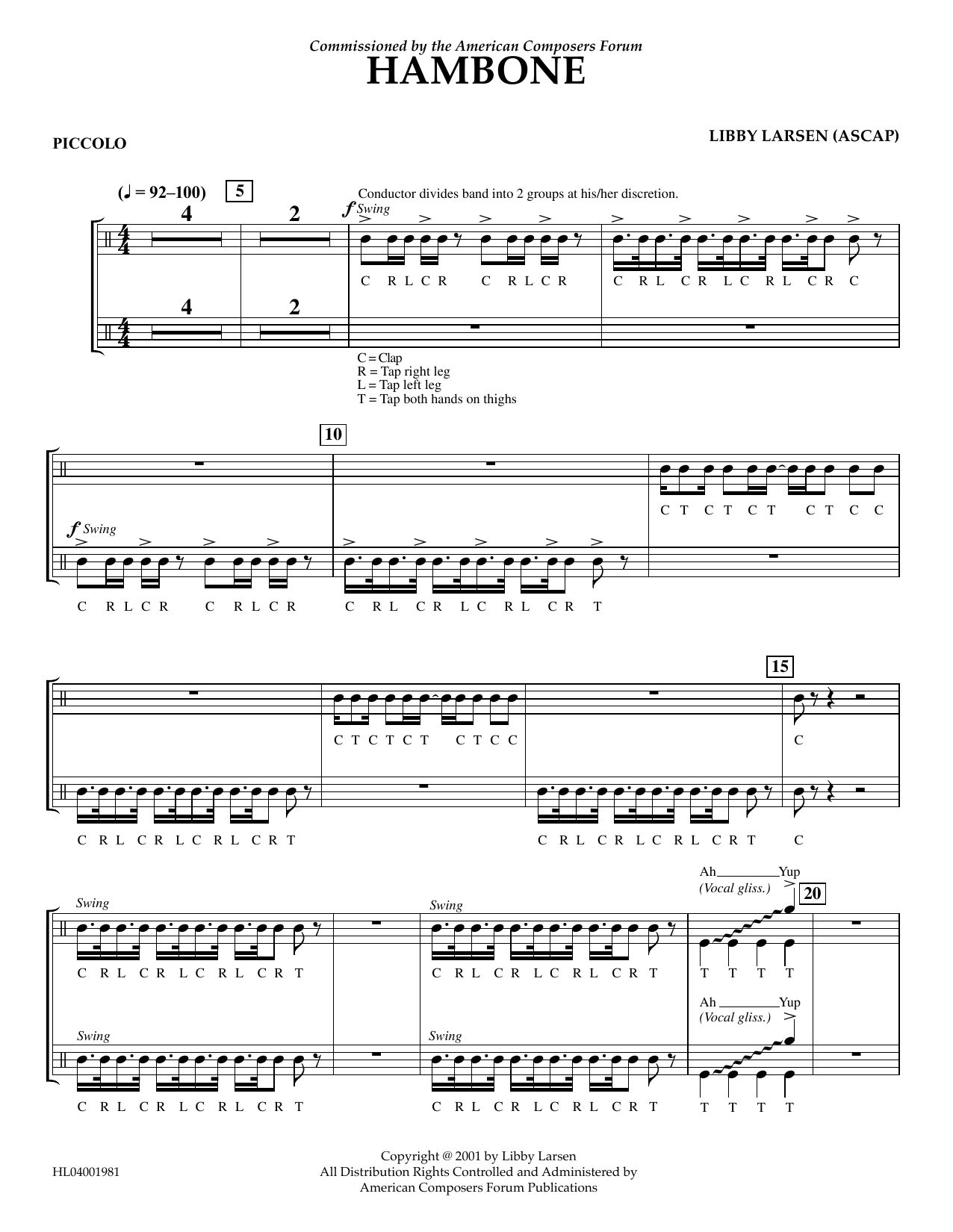 Download or print Libby Larsen Hambone - Piccolo sheet music, chords and digital score arranged for Concert Band. This Concert score includes 3 page(s).