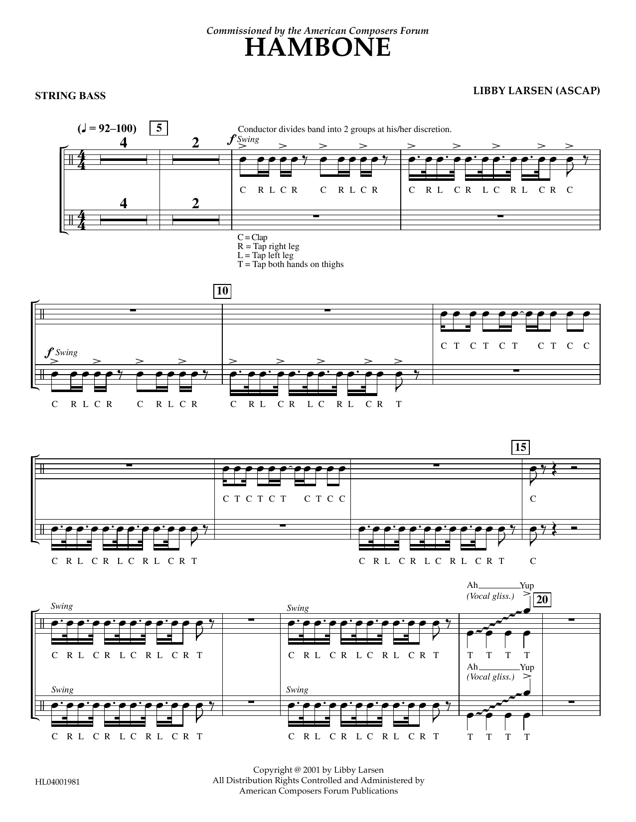 Download or print Libby Larsen Hambone - String Bass sheet music, chords and digital score arranged for Concert Band. This Concert score includes 3 page(s).