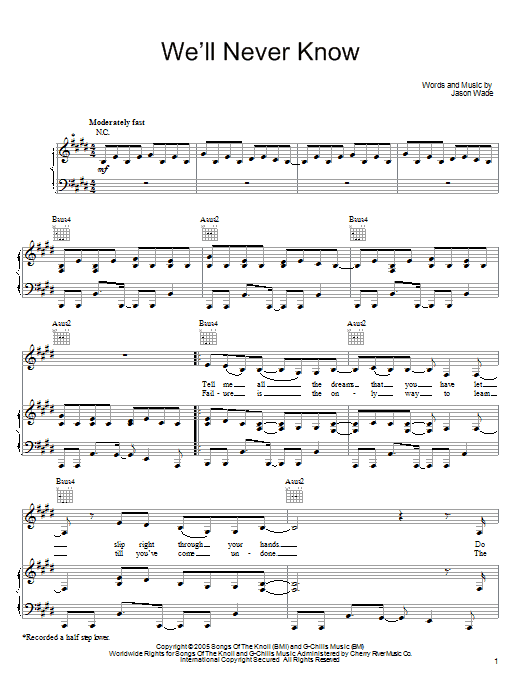 Download or print Lifehouse We'll Never Know sheet music, chords and digital score arranged for Piano, Vocal & Guitar Chords (Right-Hand Melody). This Pop score includes 5 page(s).