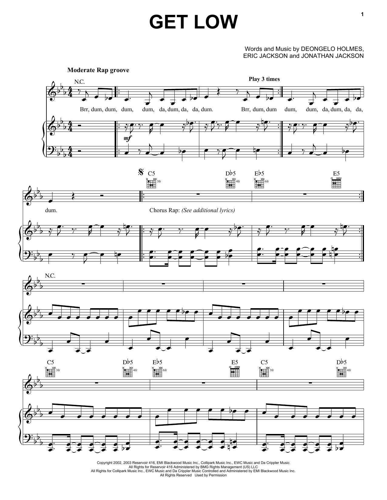 Download or print Lil' Jon and the Eastside Boys Get Low sheet music, chords and digital score arranged for Piano, Vocal & Guitar Chords (Right-Hand Melody). This Pop score includes 6 page(s).