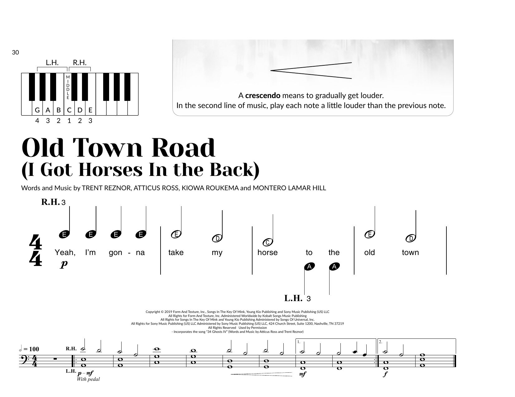 Download or print Lil Nas X feat. Billy Ray Cyrus Old Town Road (I Got The Horses In The Back) (arr. Brittany McCorriston) sheet music, chords and digital score arranged for Very Beginner Piano. This Pop score includes 2 page(s).