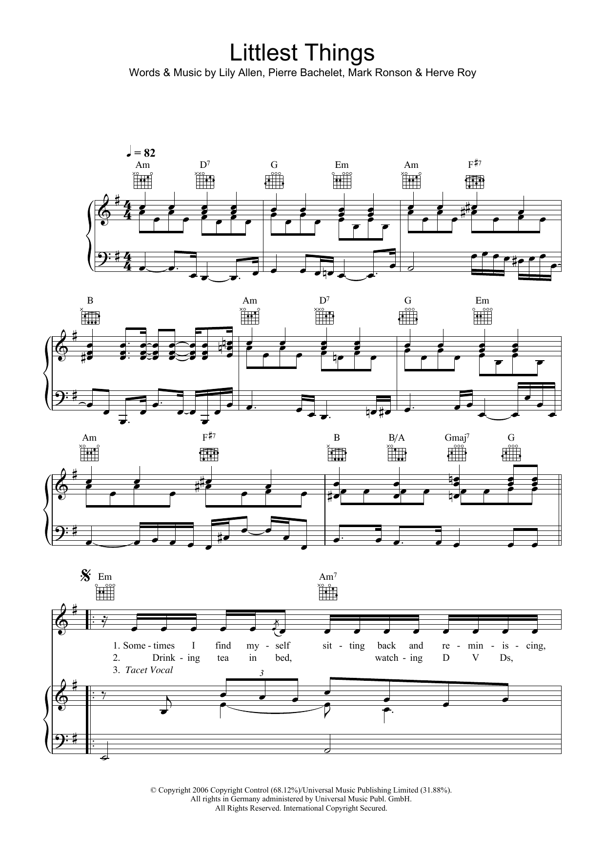 Download or print Lily Allen Littlest Things sheet music, chords and digital score arranged for Piano, Vocal & Guitar Chords. This Pop score includes 5 page(s).