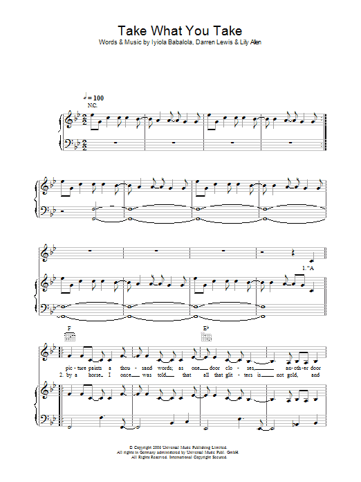Download or print Lily Allen Take What You Take sheet music, chords and digital score arranged for Piano, Vocal & Guitar Chords. This Pop score includes 6 page(s).