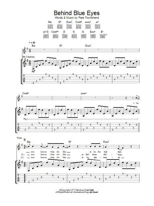 Download or print Limp Bizkit Behind Blue Eyes sheet music, chords and digital score arranged for Guitar Tab. This Film/TV score includes 5 page(s).
