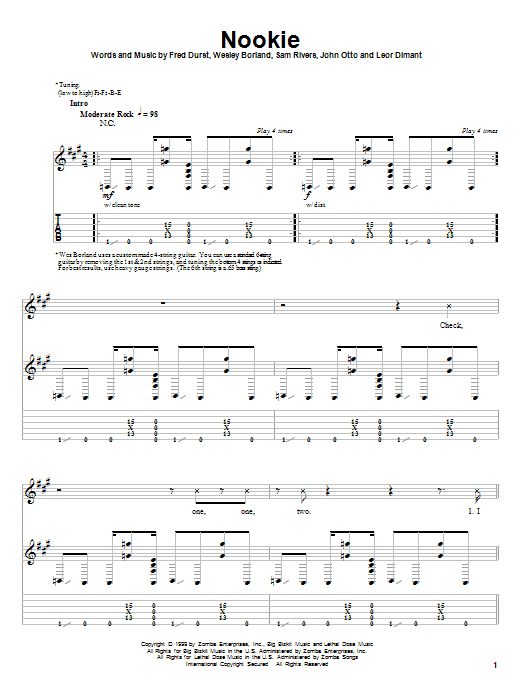 Download or print Limp Bizkit Nookie sheet music, chords and digital score arranged for Guitar Tab (Single Guitar). This Metal score includes 10 page(s).