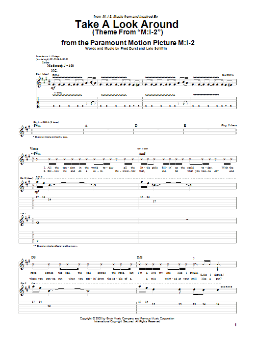 Download or print Limp Bizkit Take A Look Around (Theme From "M:I-2") sheet music, chords and digital score arranged for Guitar Tab. This Pop score includes 6 page(s).