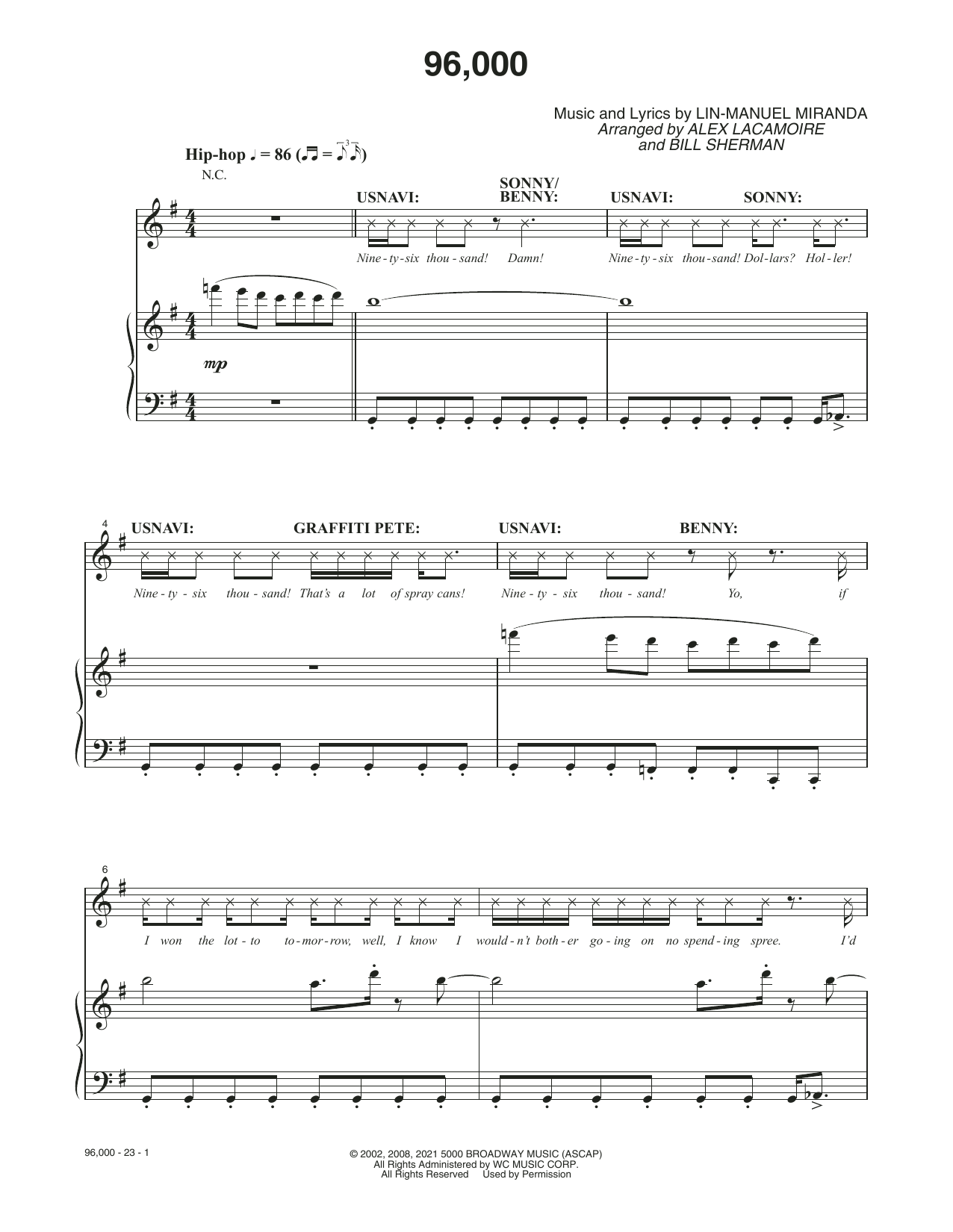 Download or print Lin-Manuel Miranda 96,000 (from the Motion Picture In The Heights) sheet music, chords and digital score arranged for Piano, Vocal & Guitar Chords. This Film/TV score includes 23 page(s).