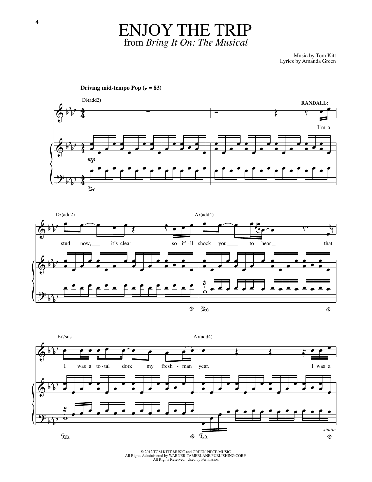 Download or print Lin-Manuel Miranda Enjoy The Trip (Solo Version) (from Bring It On: The Musical) sheet music, chords and digital score arranged for Piano & Vocal. This Musical/Show score includes 8 page(s).