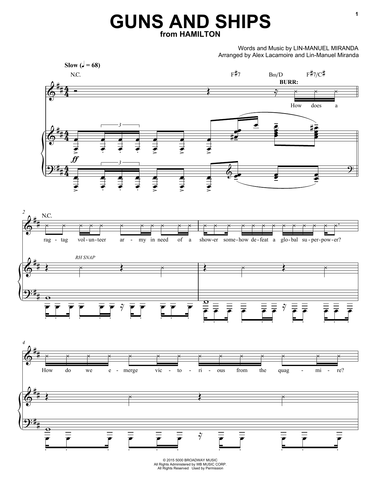 Download or print Lin-Manuel Miranda Guns And Ships (from Hamilton) sheet music, chords and digital score arranged for Piano & Vocal. This Musical/Show score includes 9 page(s).