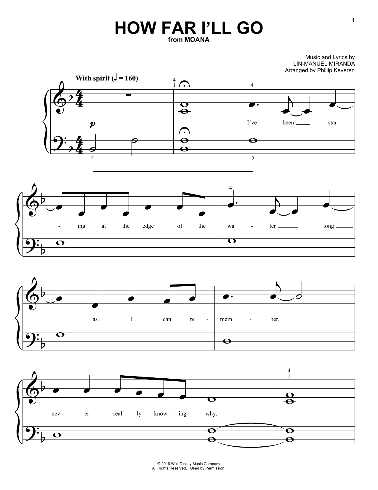 Download or print Lin-Manuel Miranda How Far I'll Go (from Moana) (arr. Phillip Keveren) sheet music, chords and digital score arranged for Big Note Piano. This Children score includes 4 page(s).