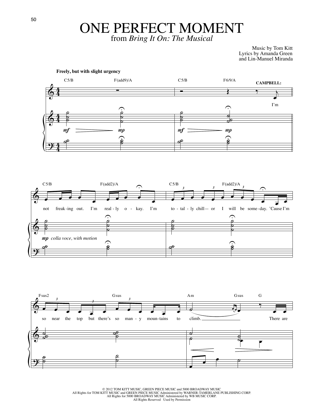 Download or print Lin-Manuel Miranda One Perfect Moment (from Bring It On: The Musical) sheet music, chords and digital score arranged for Piano & Vocal. This Musical/Show score includes 8 page(s).