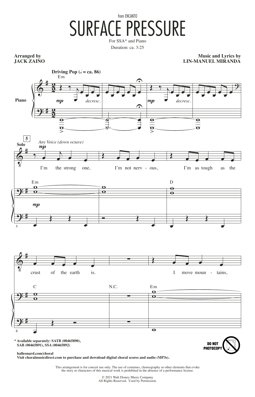 Download or print Lin-Manuel Miranda Surface Pressure (from Encanto) (arr. Jack Zaino) sheet music, chords and digital score arranged for SAB Choir. This Disney score includes 18 page(s).
