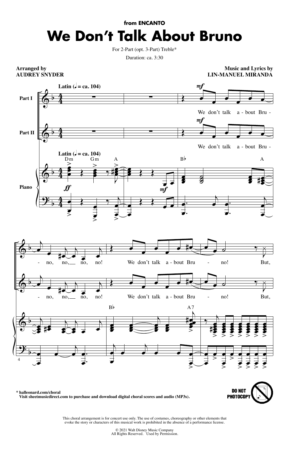 Download or print Lin-Manuel Miranda We Don't Talk About Bruno (arr. Audrey Snyder) sheet music, chords and digital score arranged for 2-Part Choir, 3-Part Mixed Choir. This Children score includes 15 page(s).