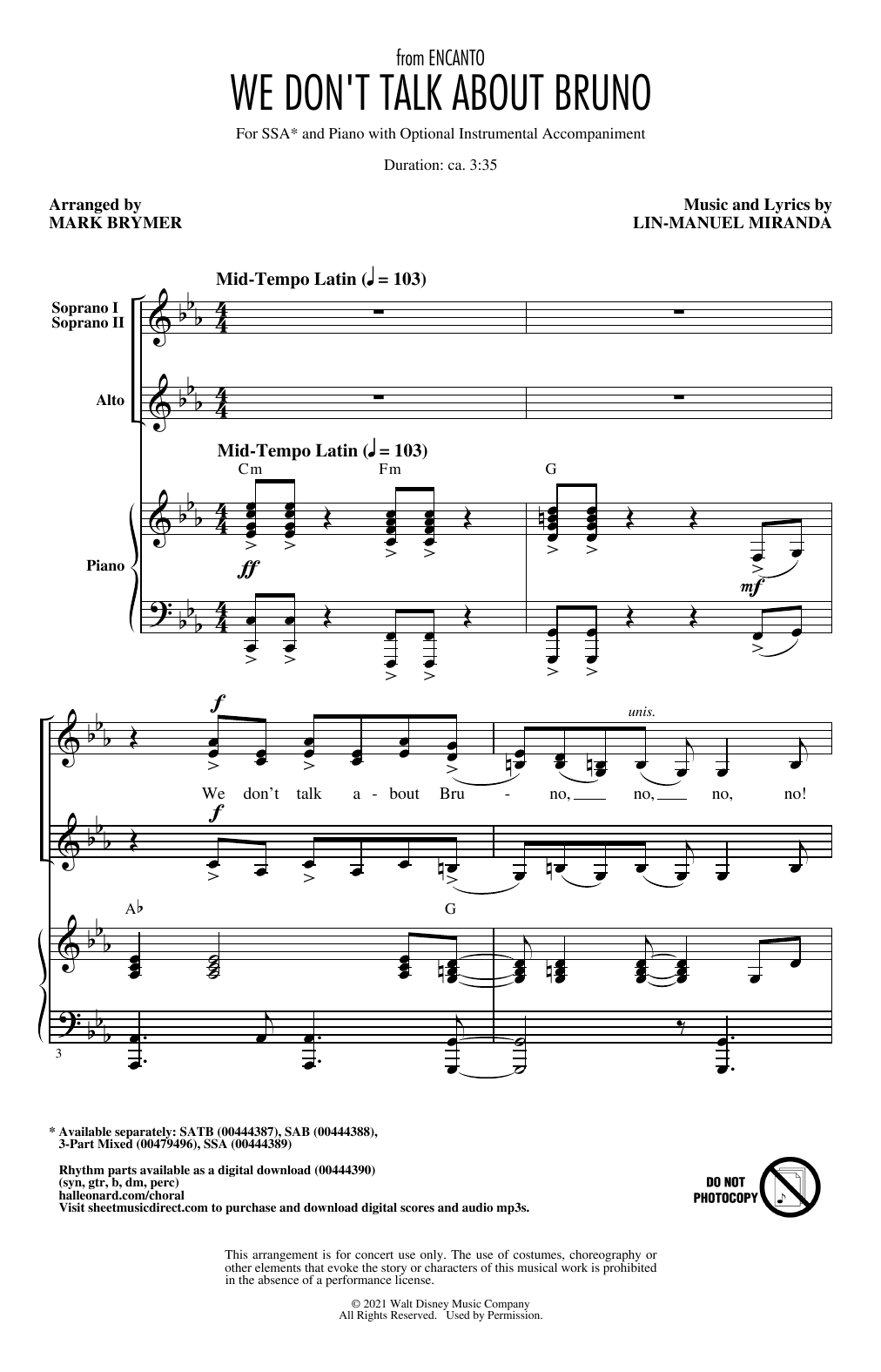 Download or print Lin-Manuel Miranda We Don't Talk About Bruno (from Encanto) (arr. Mark Brymer) sheet music, chords and digital score arranged for SSA Choir. This Children score includes 18 page(s).