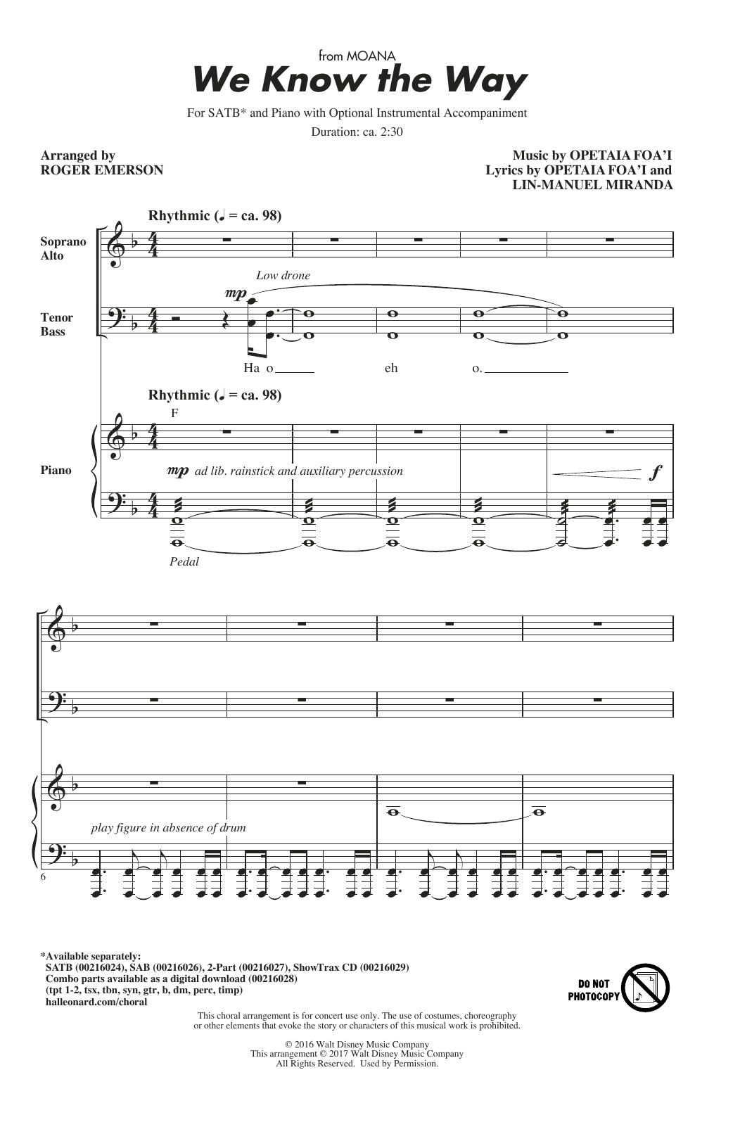 Download or print Opetaia Foa'i & Lin-Manuel Miranda We Know The Way (from Moana) (arr. Roger Emerson) sheet music, chords and digital score arranged for SAB Choir. This Children score includes 11 page(s).