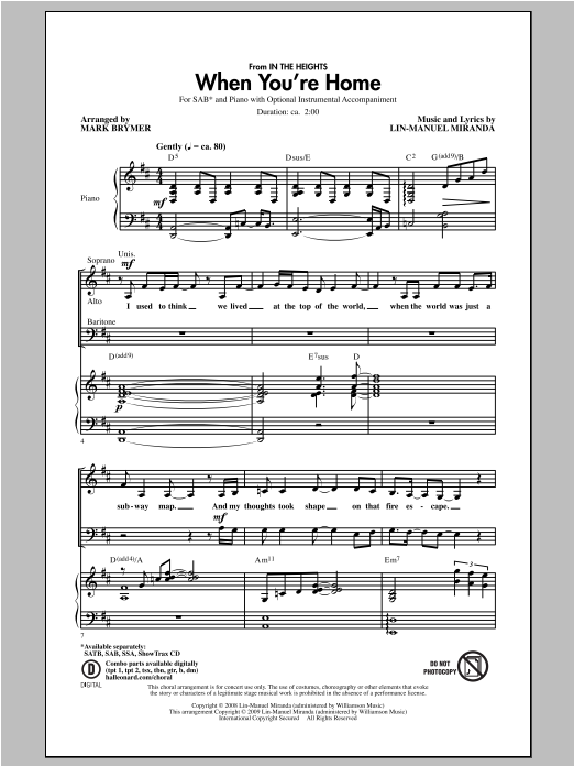 Download or print Lin-Manuel Miranda When You're Home (from In The Heights) (arr. Mark Brymer) sheet music, chords and digital score arranged for SATB Choir. This Musical/Show score includes 11 page(s).
