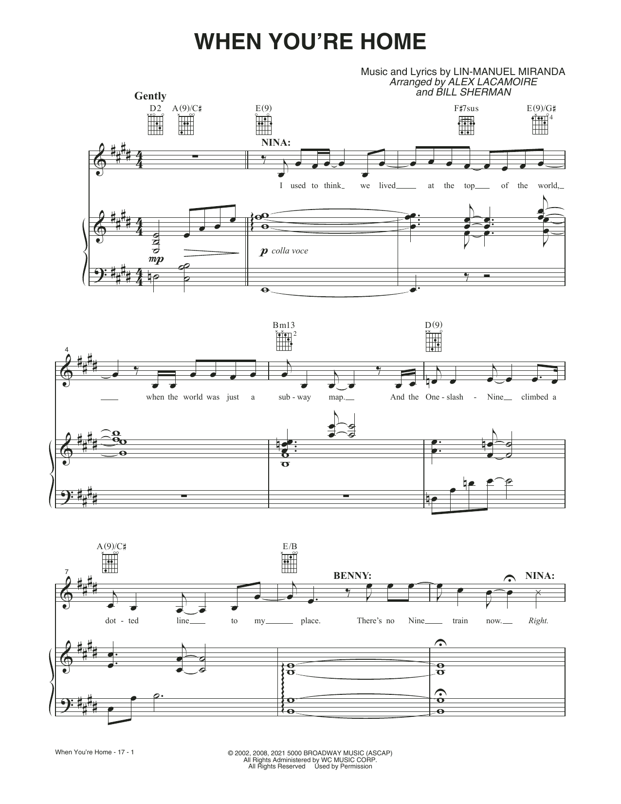 Download or print Lin-Manuel Miranda When You're Home (from the Motion Picture In The Heights) sheet music, chords and digital score arranged for Piano, Vocal & Guitar Chords. This Film/TV score includes 17 page(s).