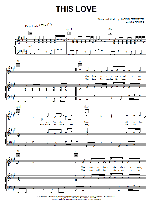 Download or print Lincoln Brewster This Love sheet music, chords and digital score arranged for Piano, Vocal & Guitar Chords (Right-Hand Melody). This Christian score includes 5 page(s).