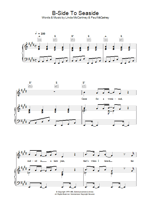 Download or print Linda McCartney B-Side To Seaside sheet music, chords and digital score arranged for Piano, Vocal & Guitar Chords. This Pop score includes 6 page(s).