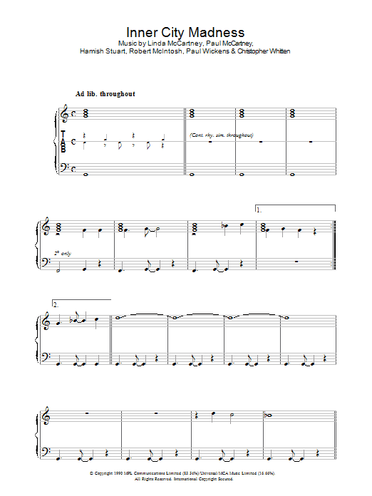 Download or print Linda McCartney Inner City Madness sheet music, chords and digital score arranged for Piano, Vocal & Guitar Chords. This Pop score includes 2 page(s).
