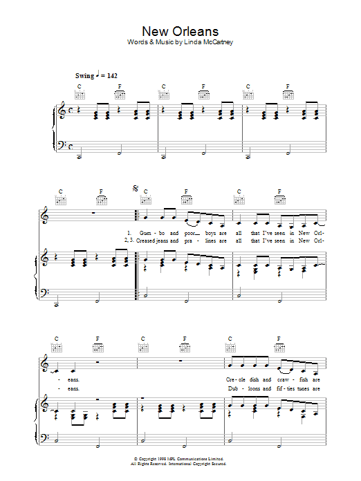 Download or print Linda McCartney New Orleans sheet music, chords and digital score arranged for Piano, Vocal & Guitar Chords. This Pop score includes 5 page(s).