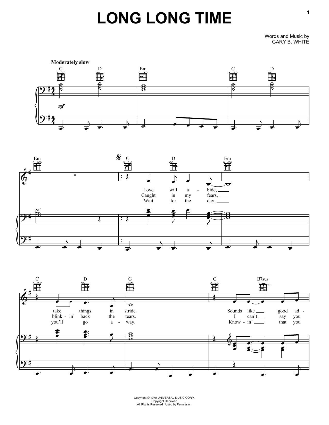 Download or print Linda Ronstadt Long Long Time sheet music, chords and digital score arranged for Tenor Sax Solo. This Pop score includes 2 page(s).