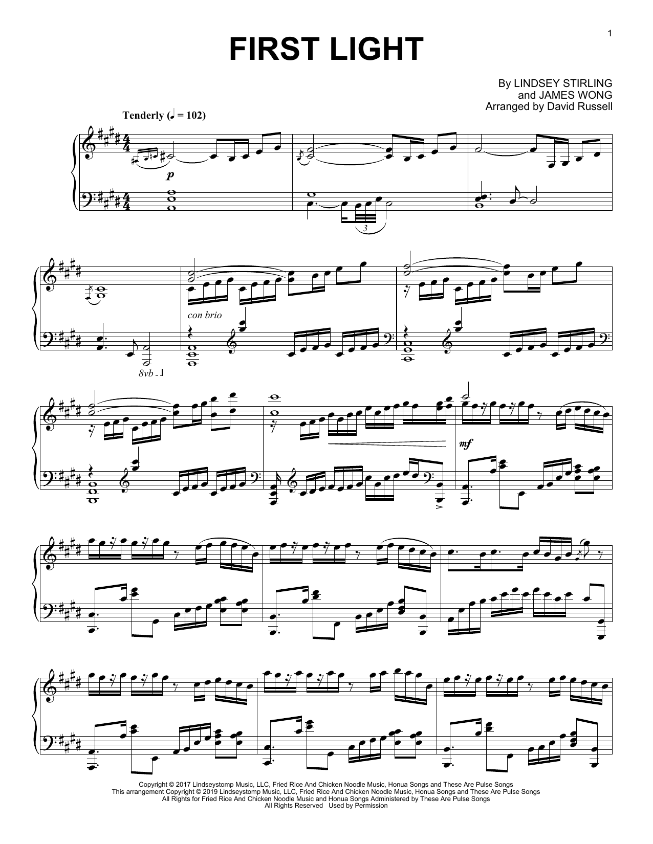 Download or print Lindsey Stirling First Light (arr. David Russell) sheet music, chords and digital score arranged for Piano Solo. This Pop score includes 4 page(s).