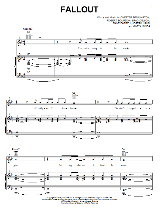 Download or print Linkin Park Fallout sheet music, chords and digital score arranged for Piano, Vocal & Guitar Chords (Right-Hand Melody). This Metal score includes 2 page(s).