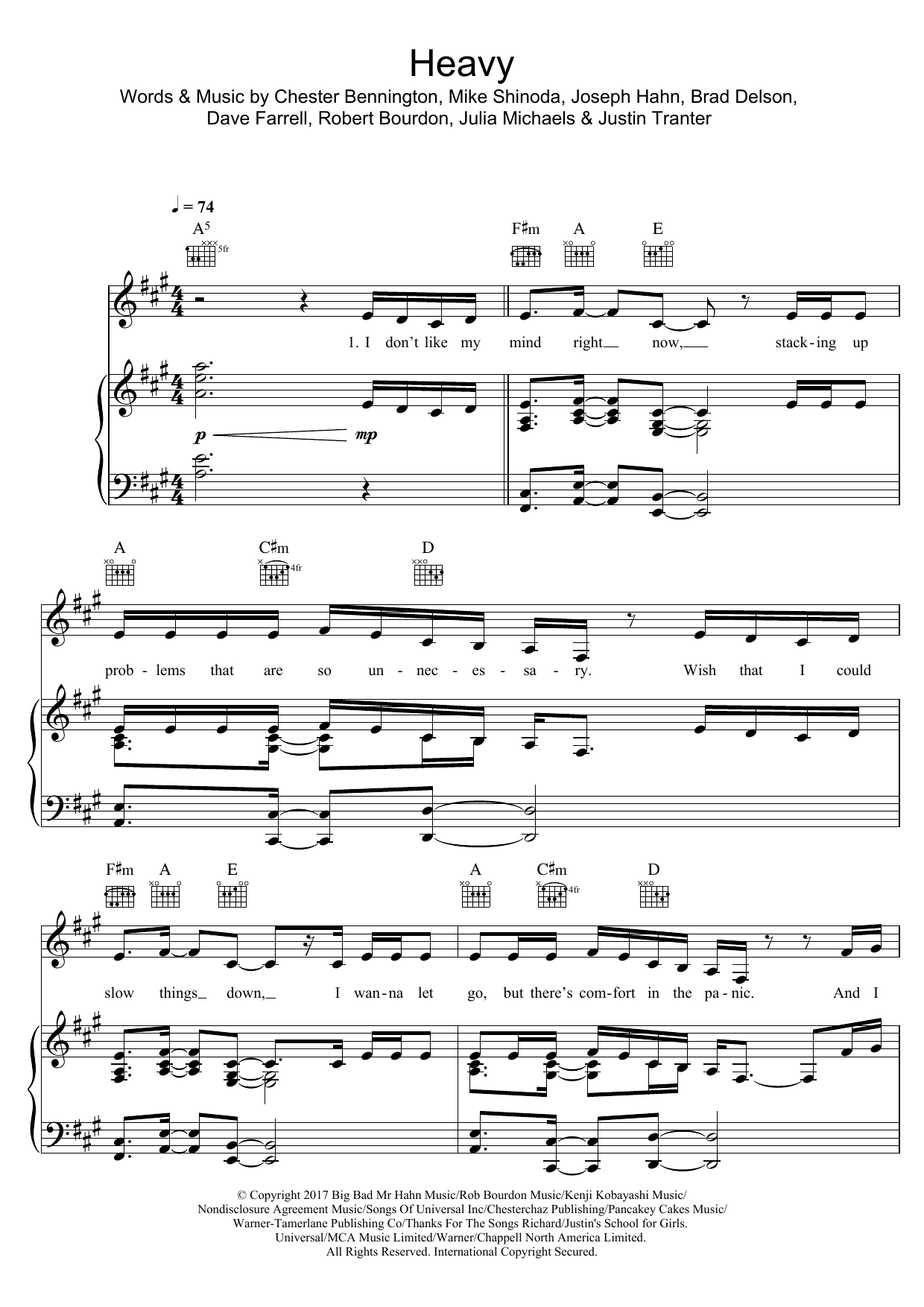 Download or print Linkin Park Heavy sheet music, chords and digital score arranged for Easy Piano. This Rock score includes 6 page(s).