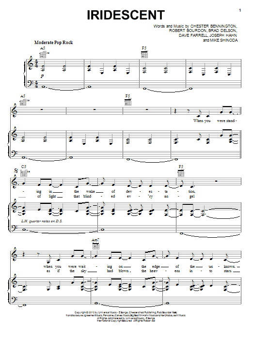 Download or print Linkin Park Iridescent sheet music, chords and digital score arranged for Piano, Vocal & Guitar Chords (Right-Hand Melody). This Metal score includes 8 page(s).