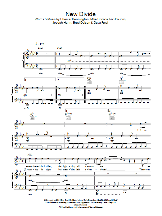 Download or print Linkin Park New Divide sheet music, chords and digital score arranged for Guitar Lead Sheet. This Pop score includes 2 page(s).