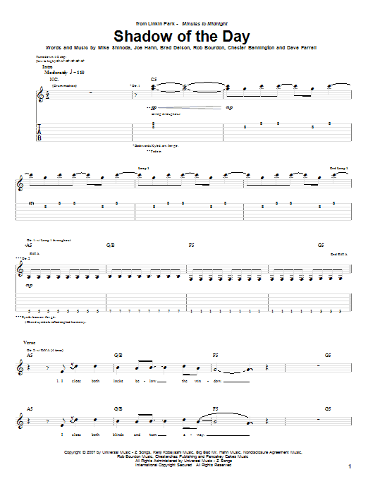 Download or print Linkin Park Shadow Of The Day sheet music, chords and digital score arranged for Guitar Tab. This Metal score includes 6 page(s).