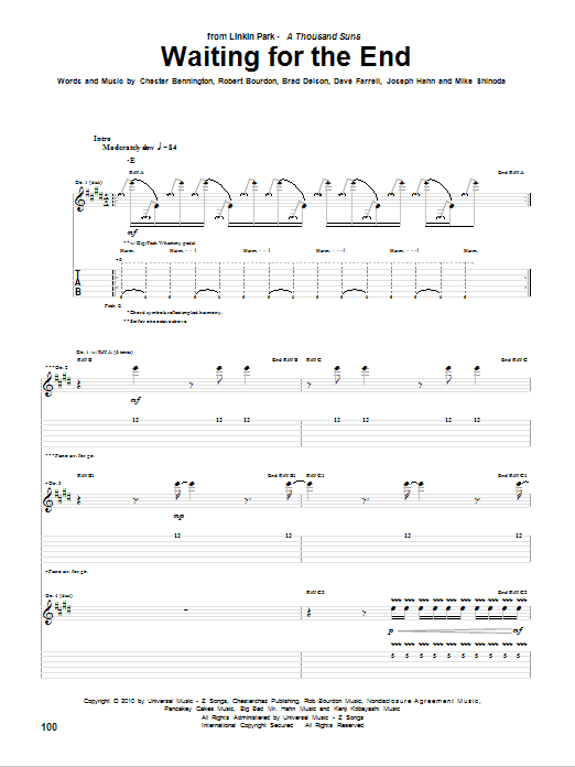 Download or print Linkin Park Waiting For The End sheet music, chords and digital score arranged for Guitar Tab. This Pop score includes 8 page(s).