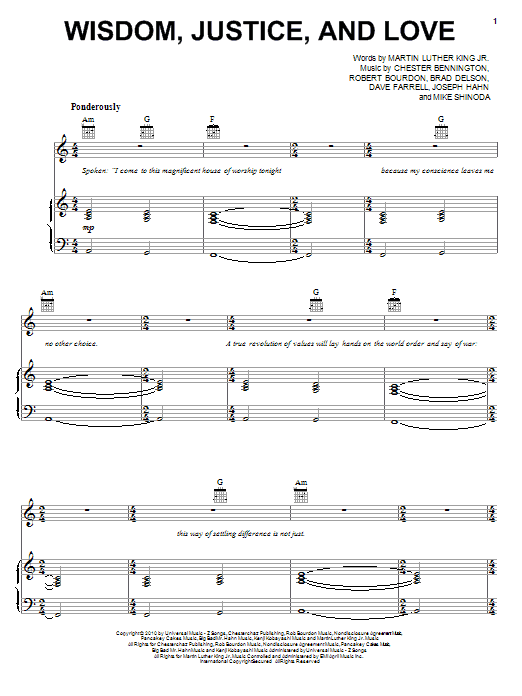 Download or print Linkin Park Wisdom, Justice, And Love sheet music, chords and digital score arranged for Piano, Vocal & Guitar Chords (Right-Hand Melody). This Metal score includes 3 page(s).