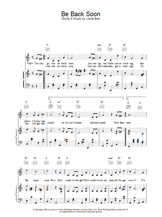 Download or print Lionel Bart Be Back Soon sheet music, chords and digital score arranged for Piano & Vocal. This Musical/Show score includes 5 page(s).
