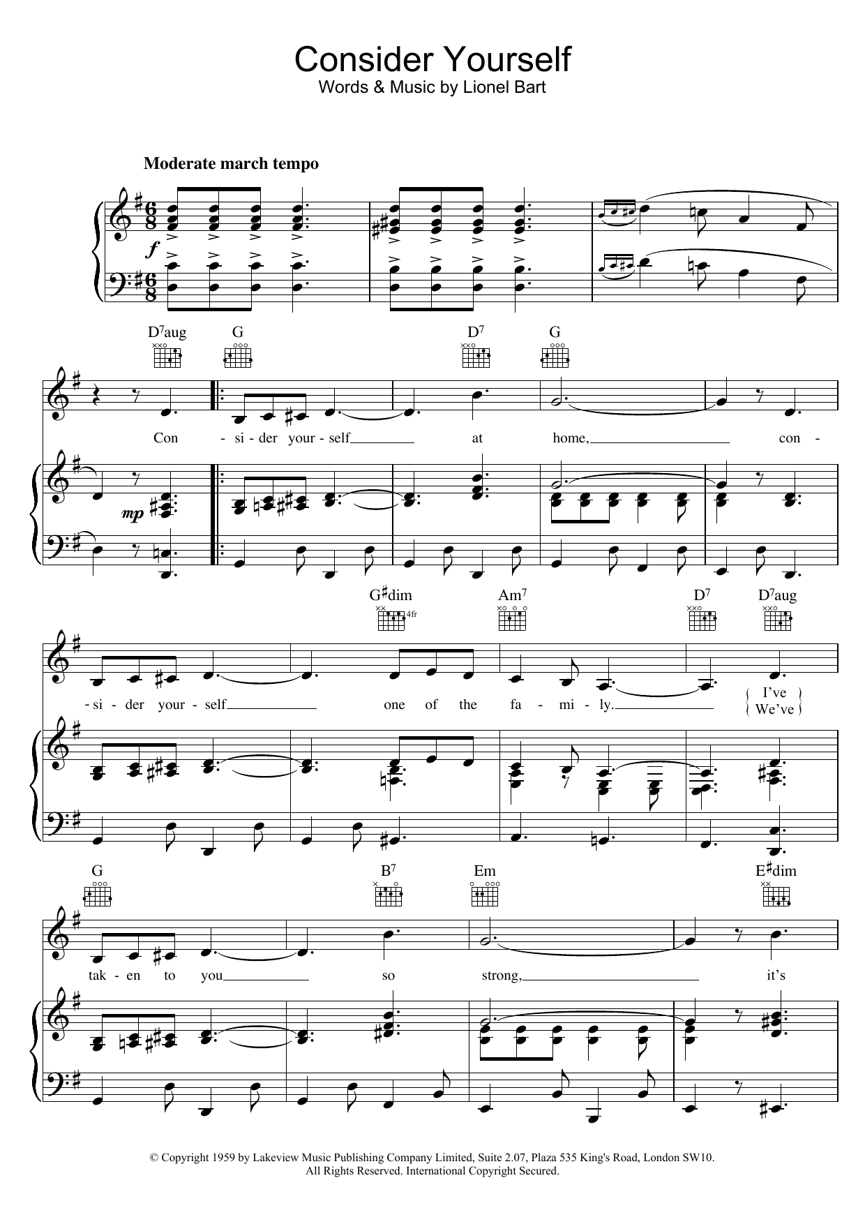 Download or print Lionel Bart Consider Yourself (from Oliver!) sheet music, chords and digital score arranged for Piano Solo. This Broadway score includes 3 page(s).