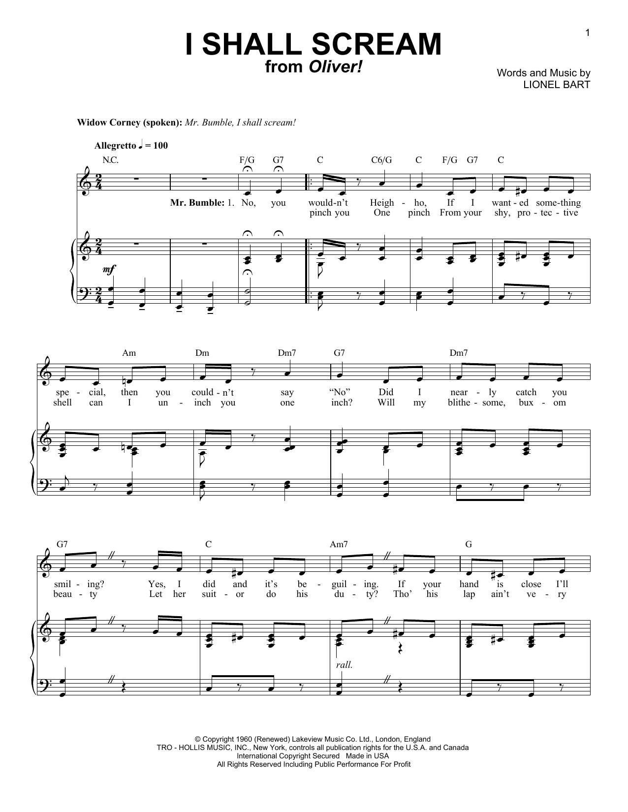 Download or print Lionel Bart I Shall Scream sheet music, chords and digital score arranged for Piano & Vocal. This Musical/Show score includes 5 page(s).