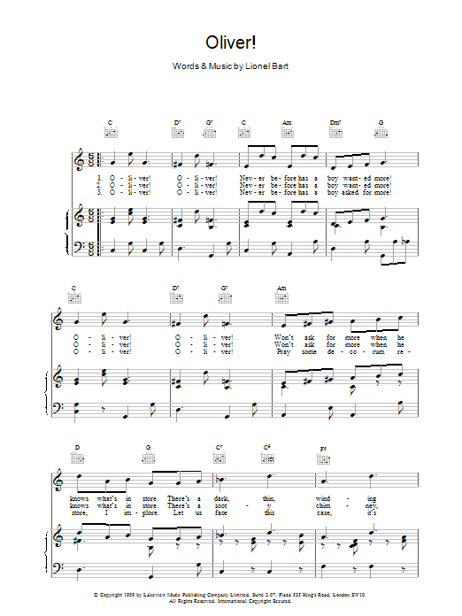 Download or print Lionel Bart Oliver! sheet music, chords and digital score arranged for Piano & Vocal. This Musical/Show score includes 2 page(s).