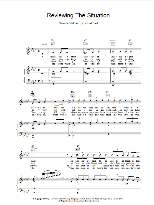 Download or print Lionel Bart Reviewing The Situation sheet music, chords and digital score arranged for Piano & Vocal. This Musical/Show score includes 3 page(s).