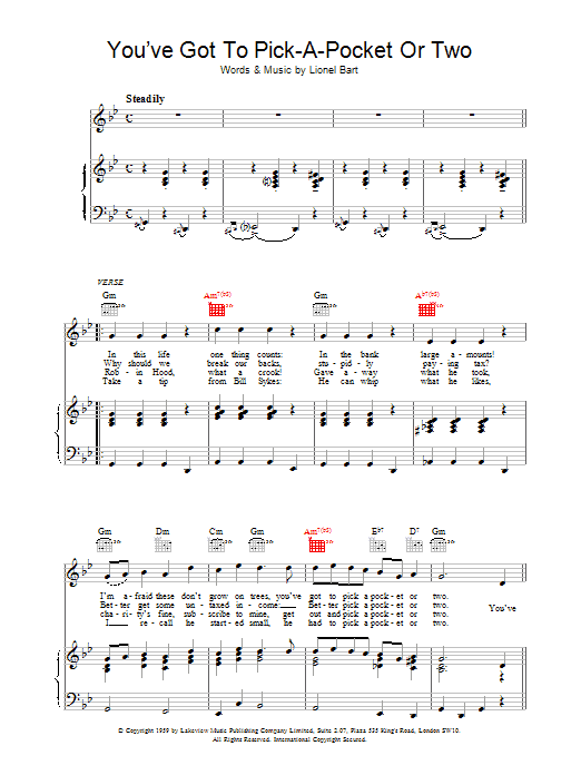 Download or print Lionel Bart You've Got To Pick-A-Pocket Or Two sheet music, chords and digital score arranged for Piano, Vocal & Guitar Chords. This Film/TV score includes 3 page(s).
