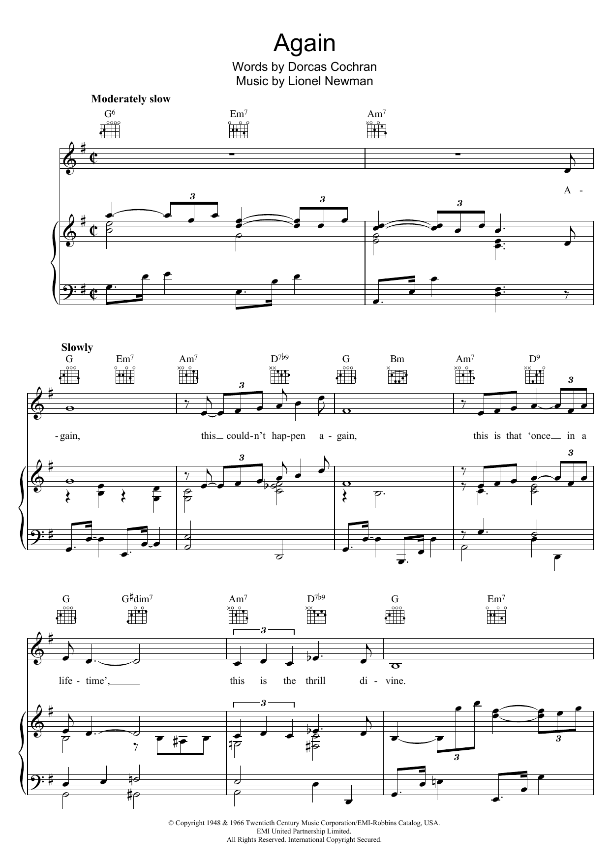 Download or print Lionel Newman Again sheet music, chords and digital score arranged for Piano, Vocal & Guitar Chords. This Standards score includes 4 page(s).