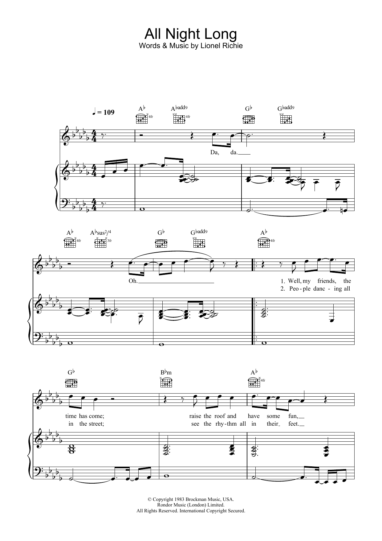 Download or print Lionel Richie All Night Long (All Night) sheet music, chords and digital score arranged for Guitar Chords/Lyrics. This Pop score includes 3 page(s).