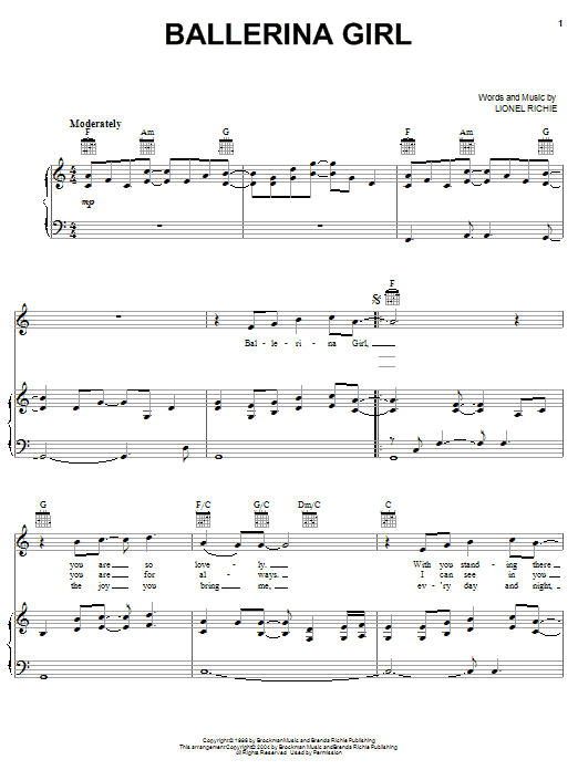 Download or print Lionel Richie Ballerina Girl sheet music, chords and digital score arranged for Lead Sheet / Fake Book. This Pop score includes 2 page(s).