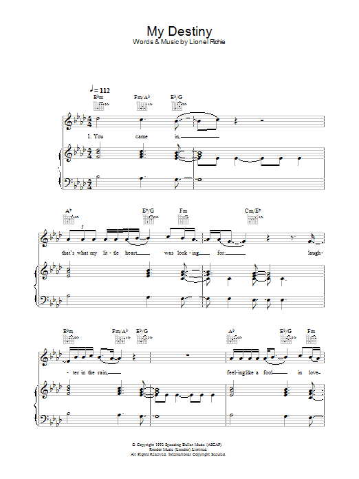 Download or print Lionel Richie My Destiny sheet music, chords and digital score arranged for Piano, Vocal & Guitar Chords. This Pop score includes 9 page(s).