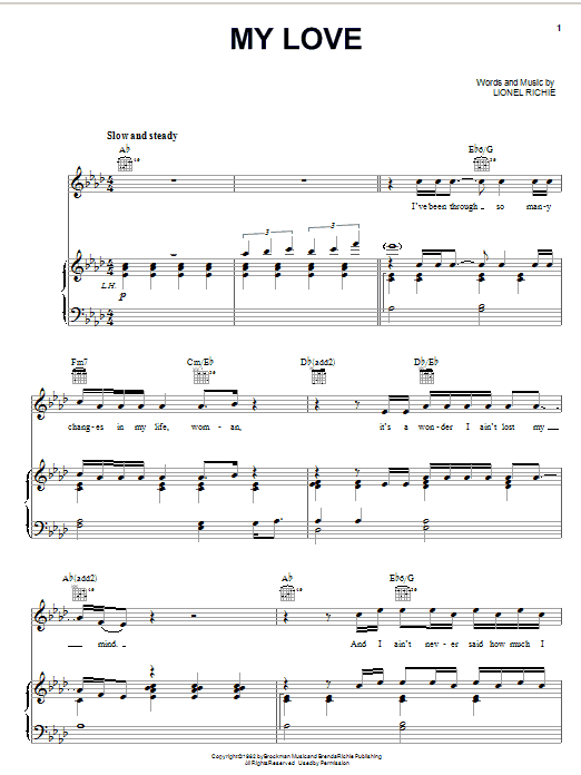 Download or print Lionel Richie My Love sheet music, chords and digital score arranged for Lead Sheet / Fake Book. This Love score includes 2 page(s).