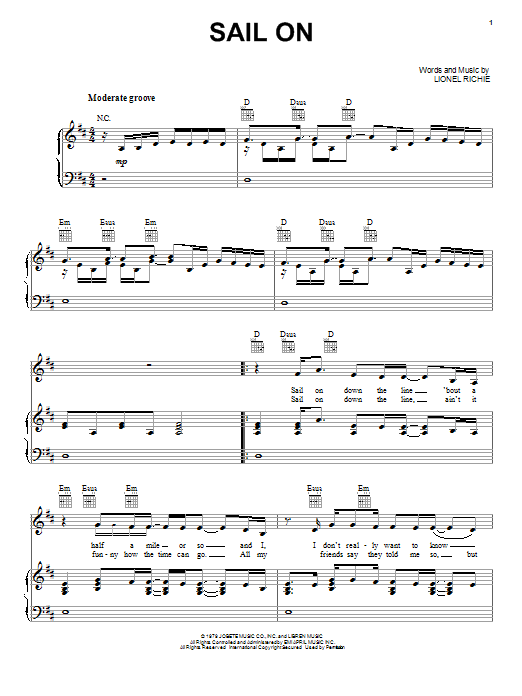 Download or print Lionel Richie Sail On sheet music, chords and digital score arranged for Piano, Vocal & Guitar Chords (Right-Hand Melody). This Pop score includes 6 page(s).